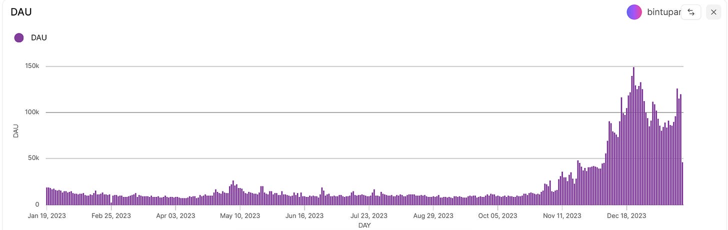 DAU Surge: Similar growth pattern, from 10k-20k to a high of 149k in December, nearly a 10x increase, with January surpassing November's average