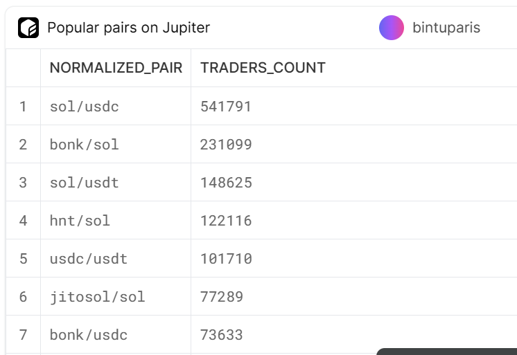 SOL/USDC: Dominant pair with 540k distinct traders, indicating a preference for stablecoin liquidity and trading against SOL.