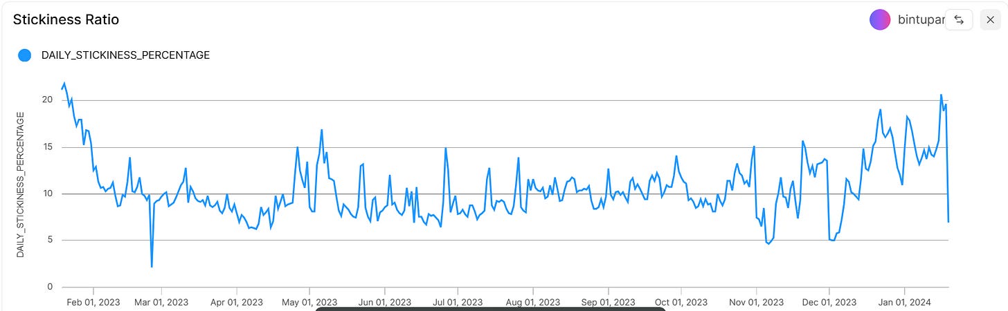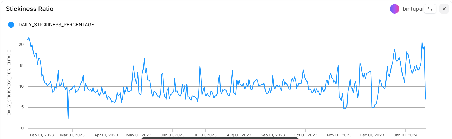 User Stickiness: The consistency of user return measured by the daily percentage of MAU actively engaging.